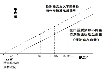 具體操作是取等量待測(cè)樣品若干份,加入不同濃度的待測(cè)組分的標(biāo)準(zhǔn)溶液進(jìn)行分析,以濃度為橫坐標(biāo),峰面積為縱坐標(biāo)繪制工作曲線。工作曲線延長(zhǎng)線在橫坐標(biāo)上的截距即為樣品中待測(cè)組分的濃度。由于待測(cè)組分以及加入的標(biāo)準(zhǔn)溶液處在相同的樣品基體中,相當(dāng)于把待測(cè)試樣作為了背景值。