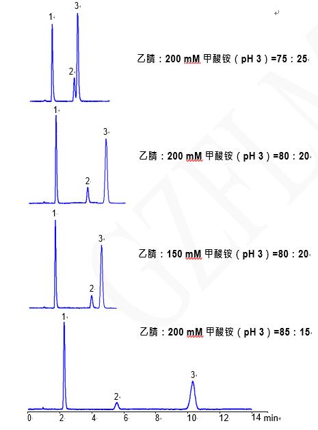 乙腈與緩沖鹽的比例,緩沖鹽的濃度可調(diào)整保留時間。