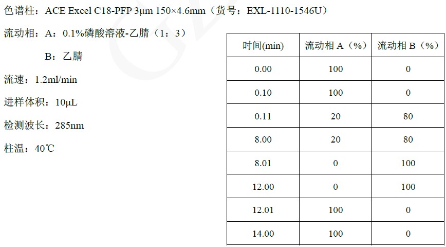 國標(biāo)中用的是C30柱,水/甲醇的流動相體系,30 min的梯度方法,我們使用ACE C18-PFP,用磷酸溶液/乙腈體系,14 min的梯度方法就可以實(shí)現(xiàn)目標(biāo)成分的分離,總體更節(jié)約分析時間。