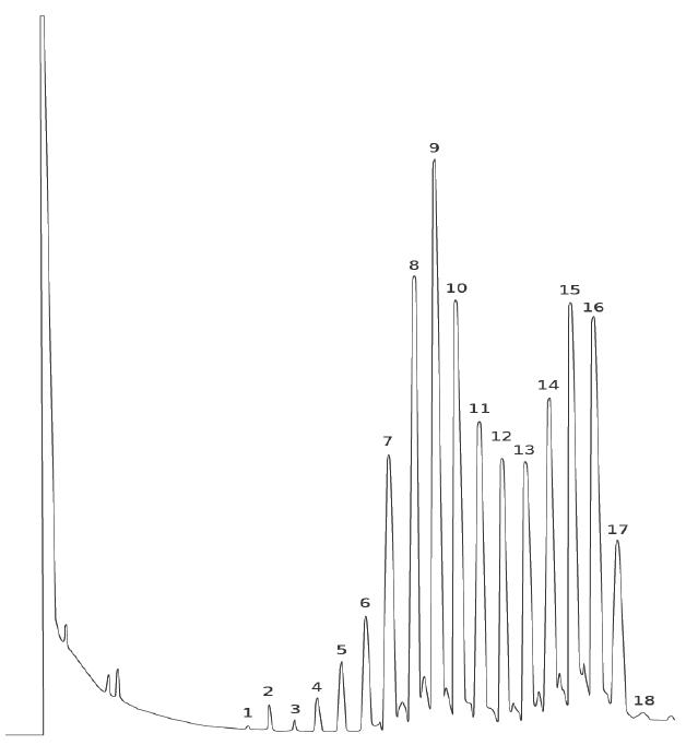 樣品:1.T24 2. 膽 固 醇 3.T26 4.T28 5. T30 6.T32 7.T34 8. T36 9. T38 10.T40 11.T42 12. T44 13. T46 14. T48 15.T50 16. T52 17. T54 18.T56(T= 總碳數(shù))