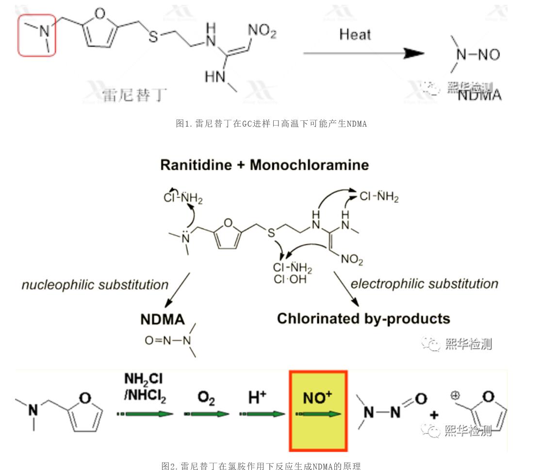 值得注意的是,有報道稱雷尼替丁在使用HS-GC-MS/MS方法檢測的時候,會出現(xiàn)假陽性結(jié)果。有研究表明,該結(jié)果是因為部分雷尼替丁樣品在GC進樣口的高溫環(huán)境下降解產(chǎn)生NDMA導(dǎo)致(圖1)。也許是冥冥之中早有定數(shù),雷尼替丁作為一個普通的組胺H2受體阻斷劑,早在2012年【1】和2014年【2】就被當(dāng)作模型化合物用于研究三級胺的亞硝酸化反應(yīng)(圖2)。上述文獻顯示,雷尼替丁在氧化劑的作用下(NH2Cl,注意不是氯化銨,該化合物是一種消毒劑)作用下,能夠通過一系列復(fù)雜的分子內(nèi)反應(yīng)生成NDMA。
