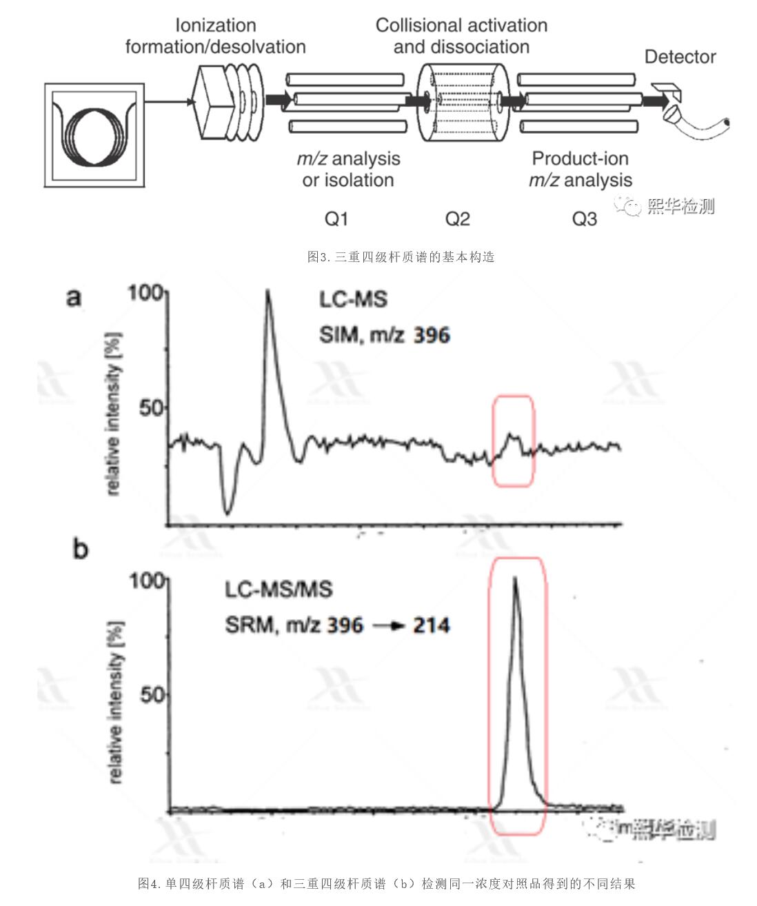 說到定量,毫無疑問,還是應(yīng)該請我們分析定量界的王者-三重四極桿質(zhì)譜上場。雖然屬于低分辯質(zhì)譜,但由于其獨特的結(jié)構(gòu)設(shè)計(圖3),通過Q1篩選母離子,Q3篩選碎片離子來濾過干擾,大大降低了噪音信號,提高了分析靈敏度(圖4)。
