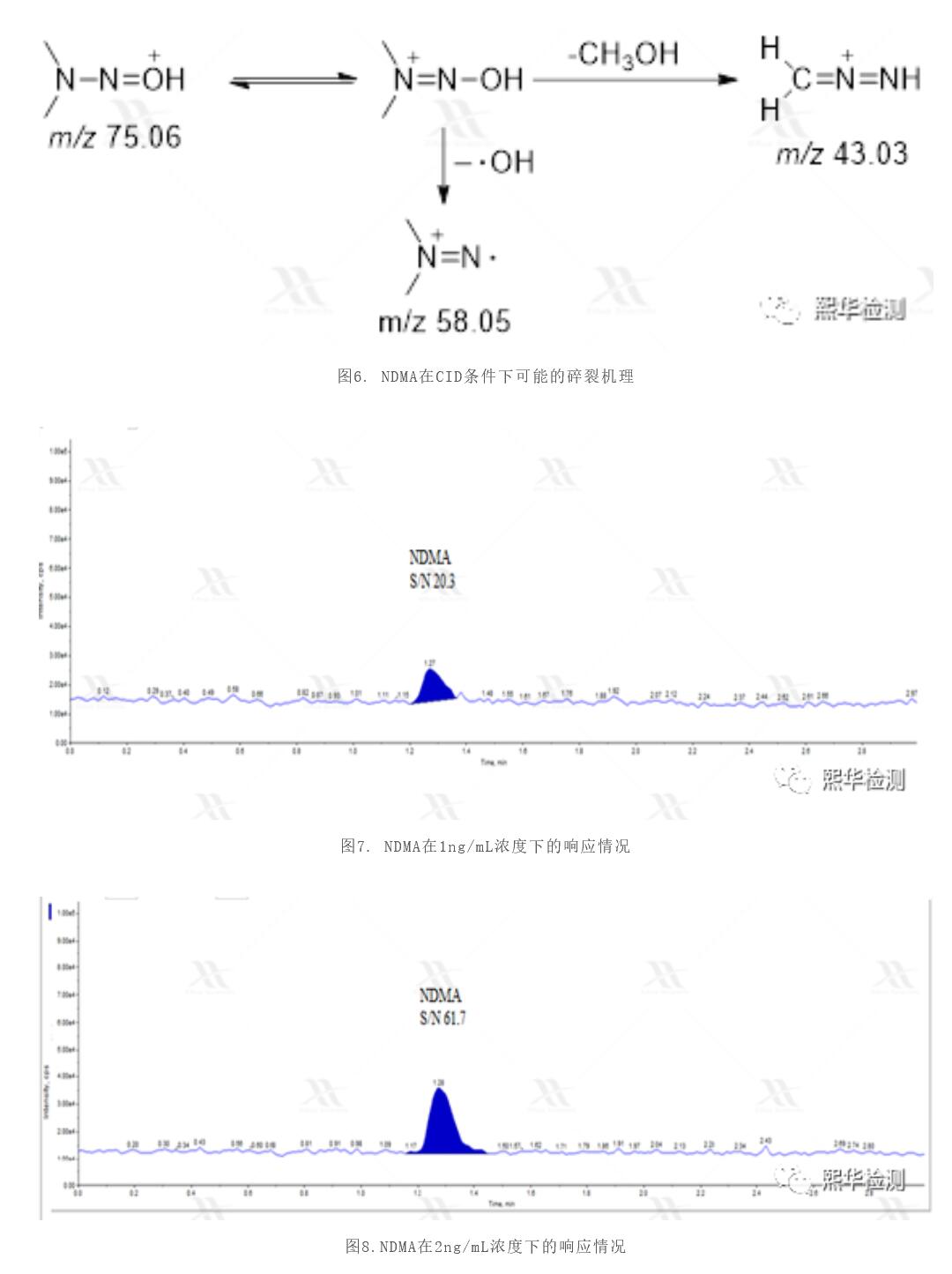 為了考察三重四極桿質(zhì)譜對NDMA的檢測能力,我們從幾臺API 6500plus液質(zhì)系統(tǒng)(市面上靈敏度和穩(wěn)定性最突出的三重四級桿質(zhì)譜)中隨機選擇了一臺并開展了試驗(圖5)。通過條件摸索,可知NDMA質(zhì)子加合物在常規(guī)CID(碰撞誘導(dǎo)解離)條件下,主要碎裂為m/z 43和m/z 58兩種碎片離子,推測其可能通過丟失甲醇分子以及羥基自由基【3】得到上述碎片(圖6)。鑒于該原理,我們使用m/z 43為定量離子,m/z 58作為定性離子。如圖7所示,使用FDA官方公布的液相條件,1ng/mL下NDMA對照品的信噪比為20.3,2ng/mL時為61.7,六針峰面積的RSD為2.5%。在有雷尼替丁及其制劑加標的情況下,回收率在90%以上,結(jié)果令人滿意。但另一方面,我們發(fā)現(xiàn)該方法的基線噪音異常地高。這也比較容易理解,因為NDMA質(zhì)子化后,質(zhì)荷比只有75,非常容易受到空氣、溶劑以及緩沖鹽體系中小分子雜質(zhì)的干擾,導(dǎo)致噪音較大。