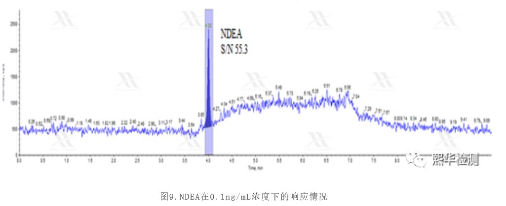 如上所述,三重四極桿質(zhì)譜對NDMA的檢測能力令人滿意,我們相信類似的方法對于NDEA的檢測效果會更佳。因為NDEA的分子量為102,受低分子量區(qū)雜質(zhì)的干擾更小,理論上應(yīng)該有更好的靈敏度。如圖9所示,在0.1ng/mL濃度下,NDEA的信噪比達到55,證實了上述推測。
