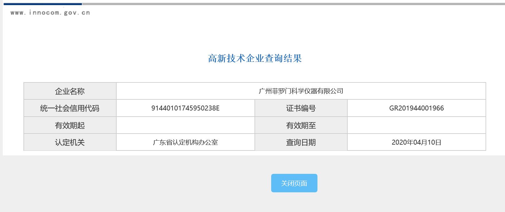 根據(jù)國家《高新技術(shù)企業(yè)認(rèn)定管理辦法》和《高新技術(shù)企業(yè)認(rèn)定管理工作指引》的相關(guān)規(guī)定,廣州菲羅門科學(xué)儀器有限公司被認(rèn)定為國家級高新技術(shù)企業(yè)。 菲羅門高新企業(yè)證書編號:GR201944001966