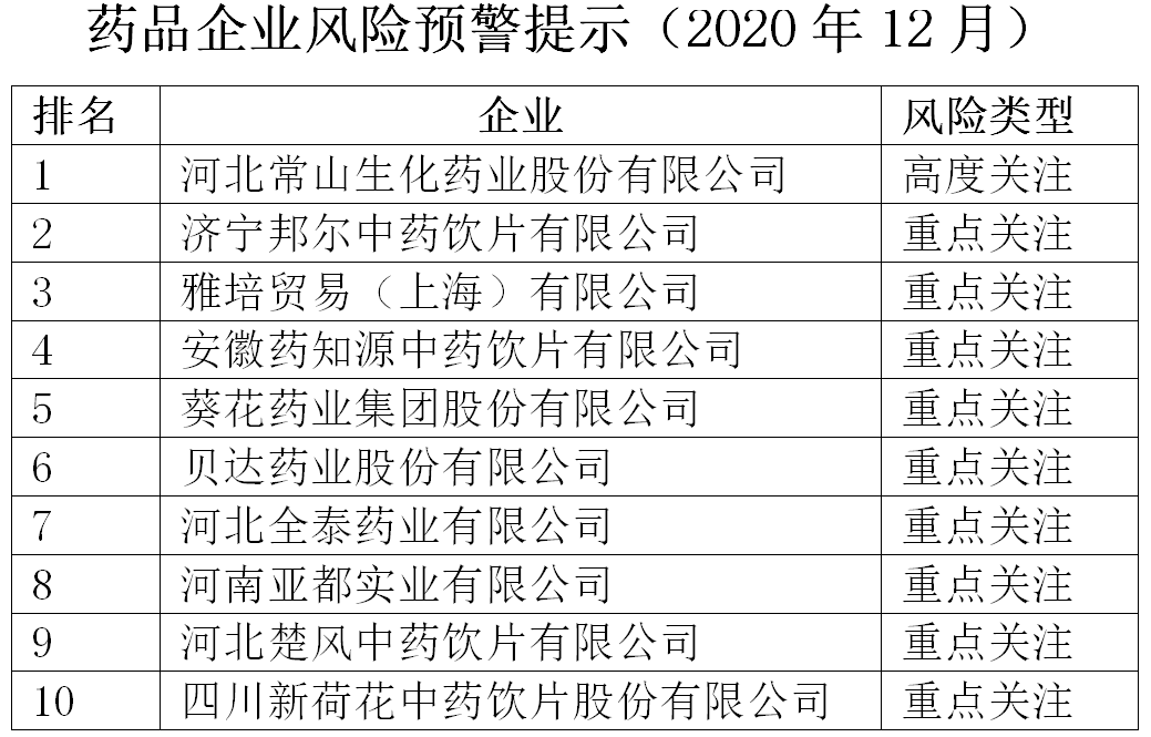 近日,中國健康傳媒集團輿情監(jiān)測中心發(fā)布藥品企業(yè)風險預警提示(2020年12月),公開風險指數(shù)排名前十的企業(yè)。河北常山生化藥業(yè)股份有限公司(以下簡稱常山藥業(yè))排名第一,為“高度關注企業(yè)”;濟寧邦爾中藥飲片有限公司、雅培貿易(上海)有限公司、安徽藥知源中藥飲片有限公司、葵花藥業(yè)集團股份有限公司、貝達藥業(yè)股份有限公司、河北全泰藥業(yè)有限公司、河南亞都實業(yè)有限公司、河北楚風中藥飲片有限公司、四川新荷花中藥飲片股份有限公司分列第2至10位,為“重點關注企業(yè)”。