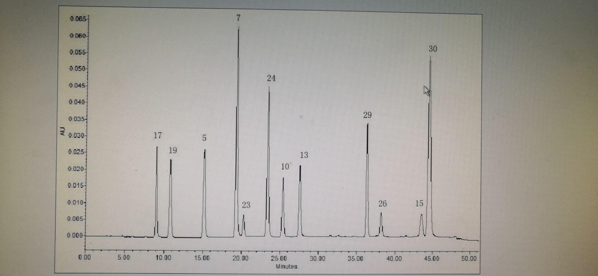 17:間苯二胺;19:氫醌;5:鄰苯二胺;7:鄰氨基苯酚;23:對(duì)甲基氨基苯酚硫酸鹽;24:4-硝基鄰苯二胺;10:甲苯-3,4- 二胺;13:6-氨基間甲酚;29:2,7-萘二酚;26:N,N-二乙基對(duì)苯二胺硫酸鹽;15:N,N-二乙基甲苯-2,5-二胺鹽酸鹽;30:N- 苯基對(duì)苯二胺