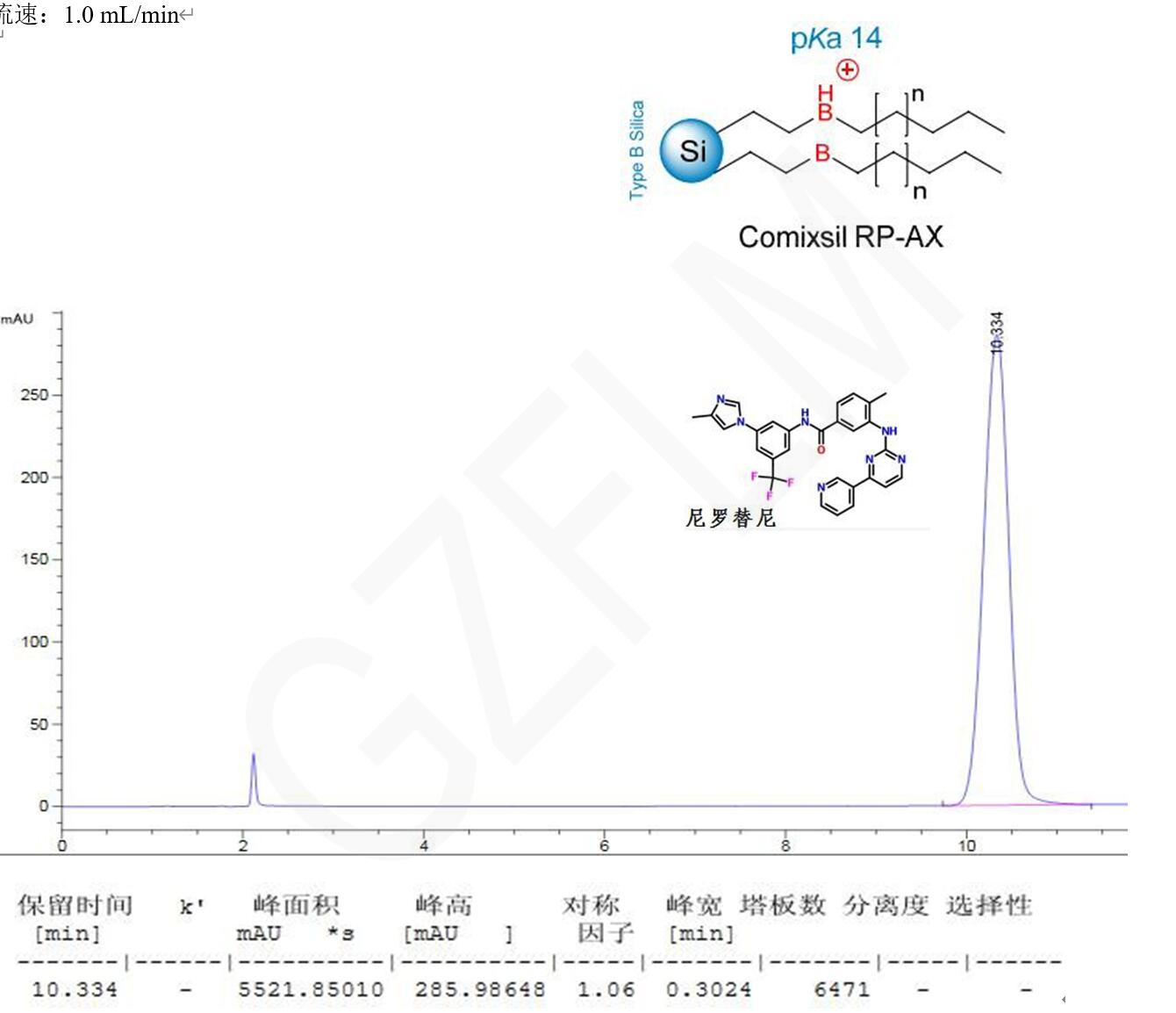 方法說明:尼羅替尼具有多個(gè)堿性基團(tuán),在 C18 柱上會(huì)出現(xiàn)明顯拖尾效應(yīng);而使用 Comixsil RP-AX 是陰離子交換+疏水混合模式,對(duì)化合物上堿性基團(tuán)是排斥作用,可以達(dá)到改善峰型的效果。