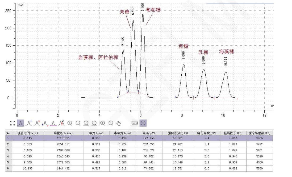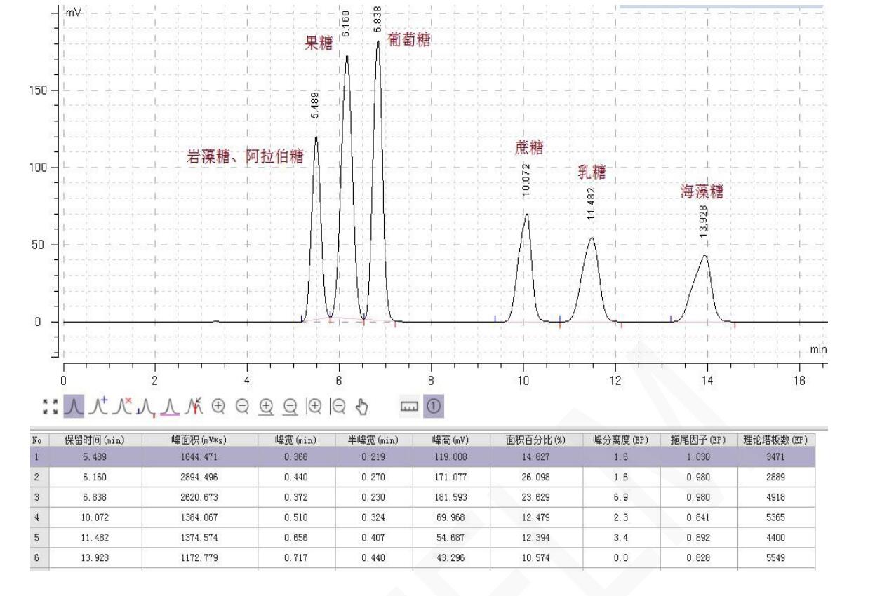 方法說明:利用Comixsil HCS 對糖類化合物進行保留并分離,上述兩個條件中,使用者可根據(jù)需求進行調整,延長保留時間可以增加分離度,但同時峰型也會發(fā)生變化,需自行評估。