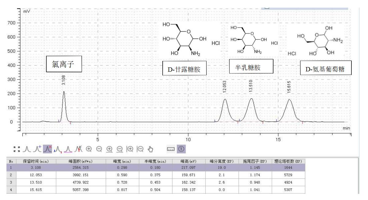 方法說(shuō)明:半乳糖胺鹽酸鹽、甘露糖胺鹽酸鹽、氨基葡萄糖鹽酸鹽,三者屬于同分異構(gòu)體的氨基糖,用Comixsil HCS 陽(yáng)離子交換+HILIC 混合模式,在上述條件下可以達(dá)到分離目的。