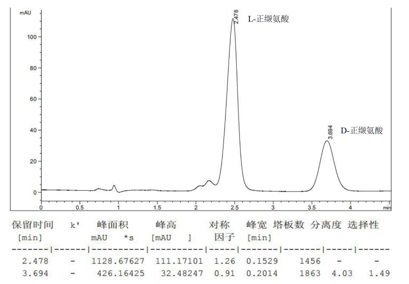 方法說明:使用 Chiral AAOA 可以能夠滿足 D、L-正纈氨酸的分離;推薦也可使用 Chiral AOAA-L (貨號(hào):FMF-AAOAL-EONU)這款手性柱進(jìn)行分離,出峰順序會(huì)與以上圖譜相反,但保留與分離度會(huì)更好。