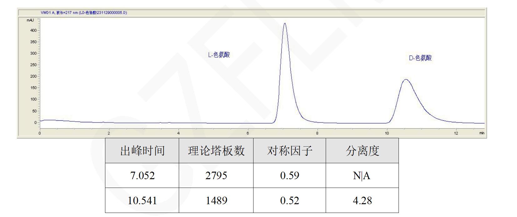 App ID: FLM-B240002 方法:自訂 色氨酸異構(gòu)體分離 色譜柱:ChiralSug TAG 5μ 250*4.6mm (貨號:FMG-TAG-EONU) 流動相: 甲醇:水=70:30 流速:1ml/min 進樣體積:1 μL 檢測波長:217 nm 柱溫:室溫