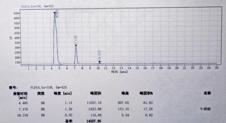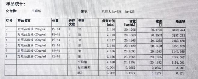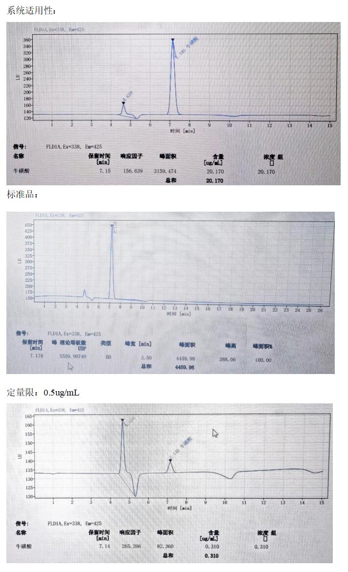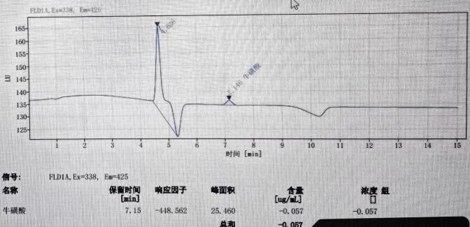 App ID: FLM-M240001 GB 5009.169-2016 食品中牛磺酸的測定 色譜柱:MARS MNa 5u,250*4.6mm(貨號:FMG-1036-EONU) 流動相:檸檬酸三鈉溶液(稱取19.6g 檸檬酸三鈉,加950mL 水溶解,加入1mL 苯酚,用硝酸調(diào)pH 至3.10-3.25, 經(jīng) 0.45um 微孔濾膜過濾。 流速:0.4mL/min 熒光衍生溶劑流速:0.3mL/min 檢測波長:激發(fā)波長:338nm, 發(fā)射波長:425nm 柱溫:55℃ 柱后衍生系統(tǒng):SSI Allchrom PCR6000 柱后衍生系統(tǒng) 檢測器:熒光檢測器進樣量:20ul 樣品: