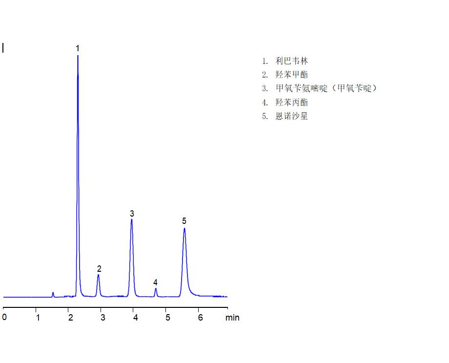 App ID: FLM-C240007 Comixsil RP-100 同時(shí)分析抗病毒藥物利巴韋林甲氧芐啶恩諾沙星羥苯甲酯 的檢測 色譜柱:Comisil RP-100 3u 150*4.6mm(貨號(hào):FMF-100R3-EONU) 流速:1 mL/min 檢測:UV 215nm 流動(dòng)相:ACN:0.3%H2SO4 = 50:50