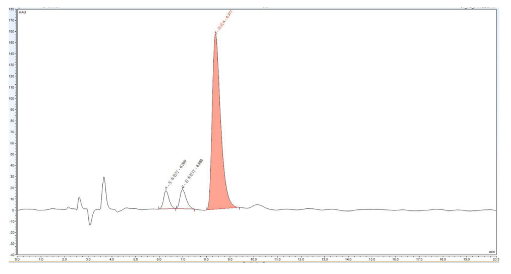 App ID: FLM-B240010 ChiralSuG TAG 手性柱對(duì)左卡尼汀,右卡尼汀,雜質(zhì) A 的分離 方法:參照USP 方法,進(jìn)行流動(dòng)相比例調(diào)整 流動(dòng)相:甲醇:0.2%三乙胺(醋酸調(diào) pH 至 6.2)=60:40 色譜柱:ChiralSug TAG 5μ 250*4.6mm(貨號(hào):FMG-TAG-EONU) 流速:0.8 mL/min 檢測(cè):UV205nm, 30oC 樣品濃度:約左卡 1.5mg/ml,右卡 1.5mg/ml,雜A0.25mg/ml 進(jìn)樣量:10 μL 溶劑:甲醇 色譜圖: