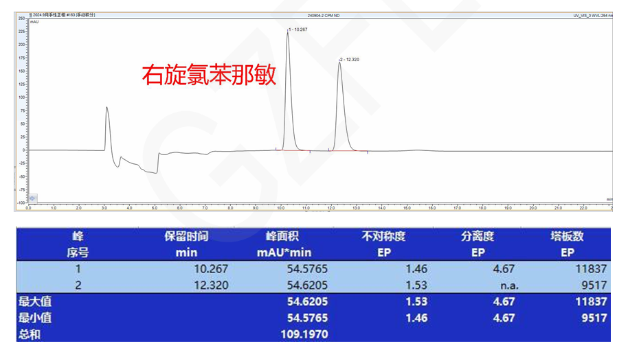 App ID: FLM-B240012 馬來(lái)酸氯苯那敏的手性拆分 色譜柱:Chiral ND(2) 5μm 250*4.6mm (貨號(hào):FMG-AC5-A01-NFC) 流動(dòng)相:正相(咨詢銷售) 流速:1.0 mL/min 檢測(cè)波長(zhǎng):254nm 柱溫:30℃ 樣品濃度:1mg/ml 進(jìn)樣量:10μl 色譜圖: