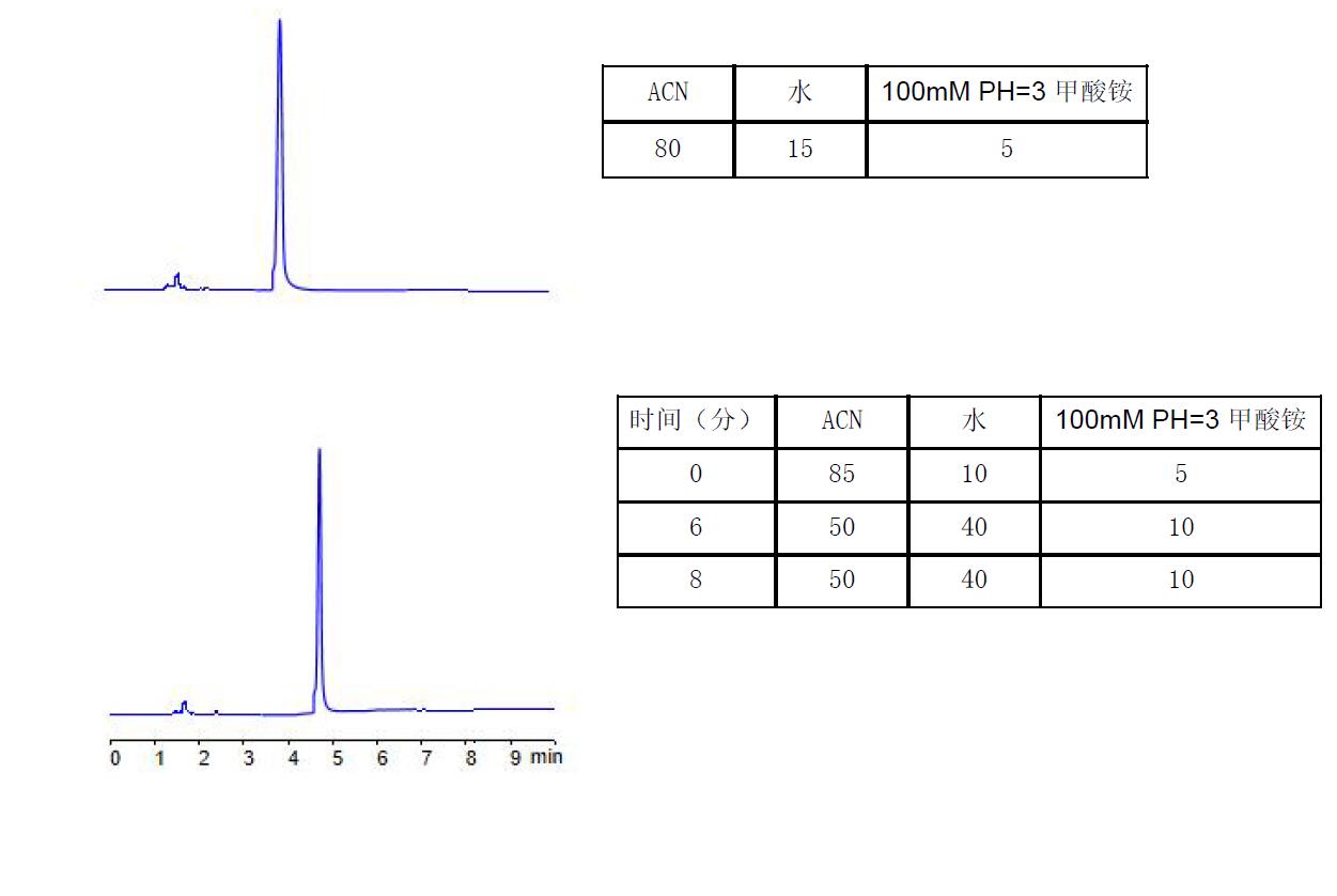 說(shuō)明:以上應(yīng)用可以簡(jiǎn)單在酸性體系下分析尼古丁。如果是用于MS 檢測(cè)器。可選擇Comxsil HAC 3u 50*2.1mm(P/N:FMB-HAC3-BONU)柱,0.2ml/min, ACN:5mM PH=3 甲酸銨=85:15,預(yù)計(jì)2min 出峰分析完畢。 該方法可避免C18 柱酸性條件下的弱保留,拖尾;避免Hilic 柱酸性條件下的重現(xiàn)性問(wèn)題,避免不喜歡用堿性條件的客戶群體。如果愿意用堿性體系的,菲羅門(mén)公司的Titank C18 柱,ACN 與碳酸氫銨的體系,也可以很好分析尼古丁,可向銷(xiāo)售代表索取應(yīng)用。 |