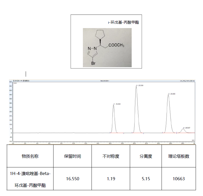 App ID: FLM-B260002 某替尼類雜質(zhì)或中間體“1H-4-溴吡唑基-Beta-環(huán)戊基-丙酸甲酯 (CAS:2201065-92-9)”的手性拆分 方法:自定 色譜柱:Chiral NQ(2)-RH 5u 250x4.6mm (貨號:FMG-AC5-A06-R) 流速:0.8mL/min 檢測器:UV 230nm 溫度:25oC 進(jìn)樣量:10uL 流動(dòng)相:咨詢 色譜圖: ![]() |