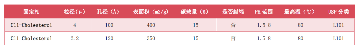 - DreamHsil C11-Cholesterol 色譜柱 C11-Cholesterol具有非常獨(dú)特的選擇性。采用獨(dú)特鍵合技術(shù),將固定相直接獨(dú)立的單點(diǎn)鍵合于Si-H鍵上直接形成Si-C鍵的C11-Cholesterol鍵合相。