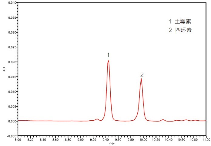2、添加水平為1mg/kg蜂蜜中四環(huán)素檢測(cè)色譜圖