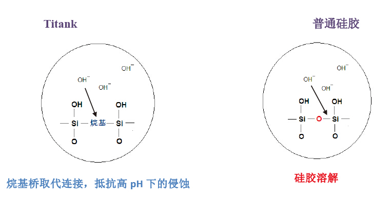 Titank 系列有機硅膠雜化基質(zhì),是在硅膠的硅氧烷網(wǎng)狀構(gòu)造中以更加穩(wěn)定的烷基來取代在堿性條件下不穩(wěn)定的硅氧橋連接,使其既具有硅膠類填料的良好分離性能和機械強度,又有聚合物填料的耐堿性。