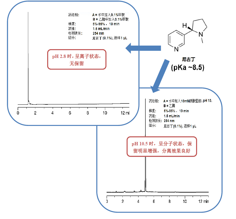 我們知道,分子的離子狀態(tài)由流動相的pH決定,因此,調(diào)整流動相 pH 能夠有效調(diào)節(jié)具有電離官能團的分析物的保留行為。