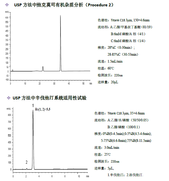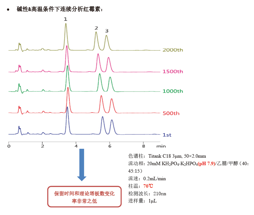 例如紅霉素,它在酸性條件下極易分解,并且需要高溫來維持良好的峰形,普通硅膠基質(zhì)色譜柱是難以耐受這種分析環(huán)境,這時,就需要 Titank系列有機硅膠雜化色譜柱來解決上述分析難題。