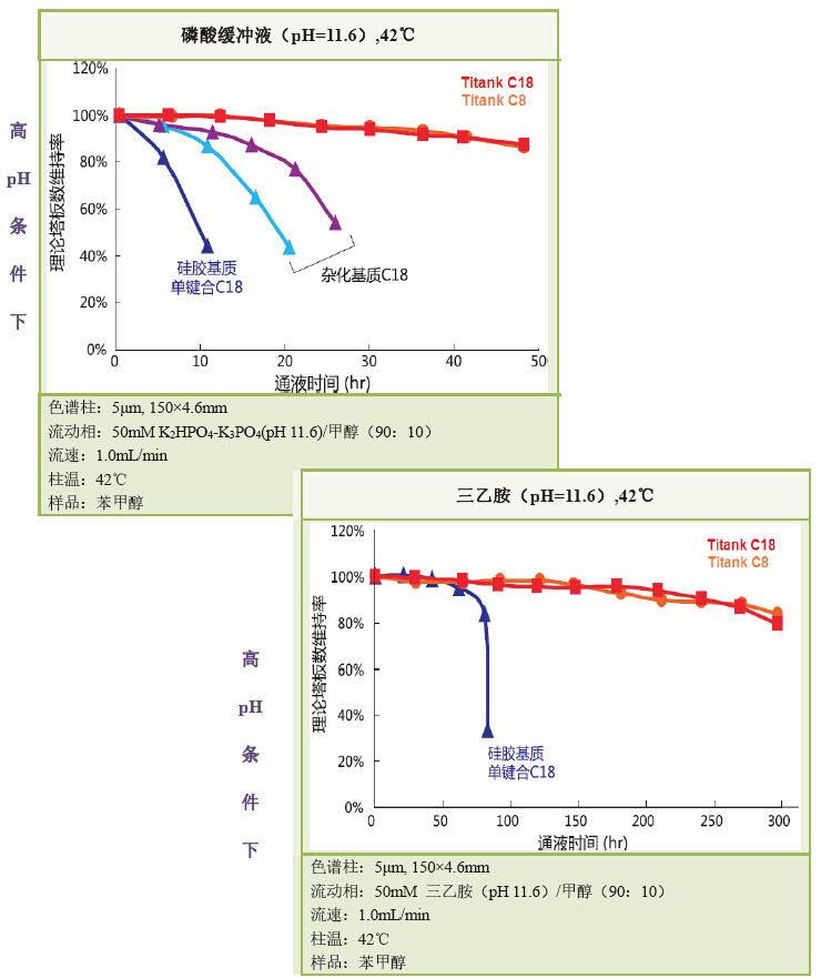從以上兩組數(shù)據(jù)可以發(fā)現(xiàn),在強堿或高溫等苛刻條件下的 Titank C18/C8 的色譜柱壽命,都遠在市售高耐堿性柱和普通硅膠基質(zhì)ODS柱之上。
