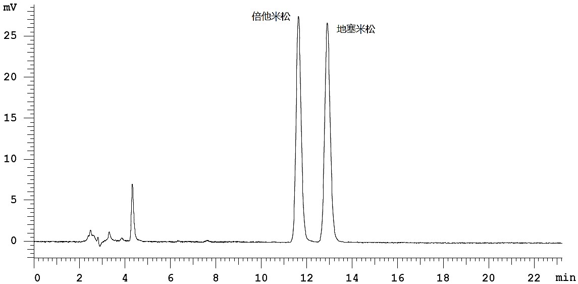 注:如將流動(dòng)相中有機(jī)相比例進(jìn)一步降低(約為 28.5%),使保留時(shí)間后移,倍他米松與地塞米松的分離度將進(jìn)一步得到提高,從而延長色譜柱的使用壽命。