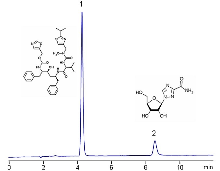 利托那韋是一種抗逆轉(zhuǎn)錄病毒藥物,屬于蛋白酶抑制劑類,用于治療 HIV 感染和 AIDS。利托那韋具有強疏水性且不可電離,它在反相色譜上保留過強。利巴韋林是一種抗病毒藥物, 可以有效對抗許多 DNA 和 RNA 病毒。利巴韋林屬于核苷酸抗代謝藥物,具有強親水性。對于 HPLC 分離,利托那韋和利巴韋林是兩種性質(zhì)差異非常大的藥物??梢圆捎糜H水作用色譜, 在 Primesep N 上對強疏水和強親水藥物進行分離。