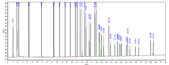 FB-FameWax 氣相色譜柱用于開發(fā)了魚油中脂肪酸甲酯及其脂肪酸在 20-30 分鐘內(nèi)的快速可重復性分離。