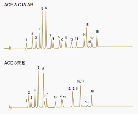C18-AR可能具有其它不同的分離機(jī)制,可以為復(fù)雜的混合物帶來更好的分離效果。對(duì)于其他混合物,可能不是這種情況,這是ACE鍵合相的優(yōu)勢(shì)。