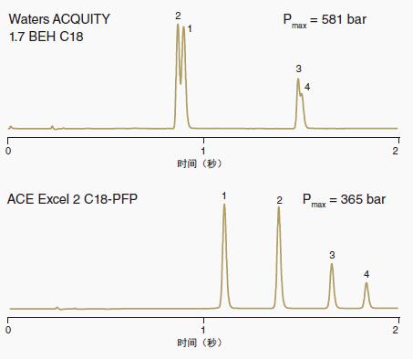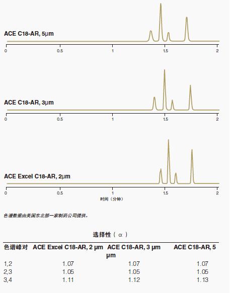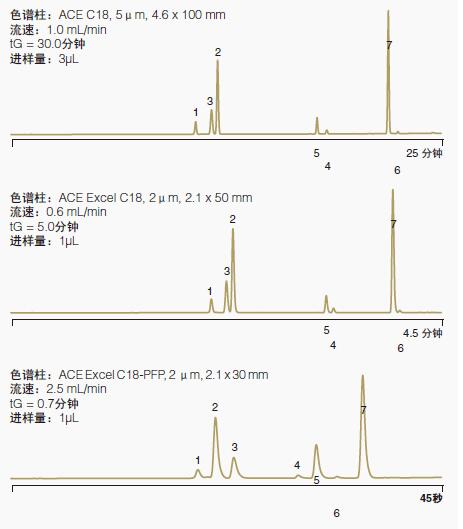 試驗(yàn)樣品的這些色譜圖在ACE Excel C18 2μmUHPLC色譜柱、ACE C18 3μmHPLC色譜柱和ACE C185μm色譜柱上以相同的流動(dòng)相條件運(yùn)行,結(jié)果闡明ACE固定相的選擇性一致,無論填充粒徑如何。