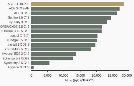 盡管所有ACE鍵合相的穩(wěn)定性都很優(yōu)異,但是一些鍵合相并不像其它鍵合相那樣穩(wěn)定。例如,通常認(rèn)為C18鍵合比柱長較短的烷基相、PFP相和苯基鍵合相更穩(wěn)定。