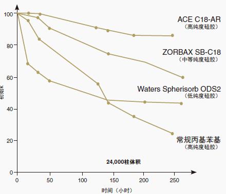 使用設(shè)計(jì)用于加速柱降解下的條件,ACE C18-AR相顯示保留損失極少,其壽命相當(dāng)于高度穩(wěn)定的ACE C18相。兩種固定相均由相同的超純硅膠而制成,而且比Zorbax SB-C18的耐久性更好(Zorbax SB-C18曾視作在高溫和低pH條件下具有極好穩(wěn)定性的固定相)。