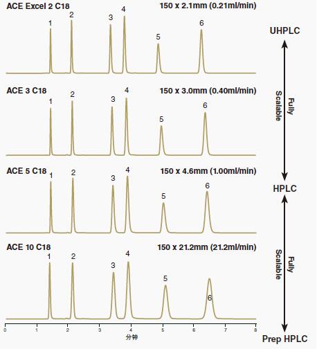 當(dāng)使用ACE Excel UHPLC色譜柱進(jìn)行快速方法開發(fā),且該方法必須可轉(zhuǎn)移到HPLC時(shí),易擴(kuò)展性則顯得特別有價(jià)值。